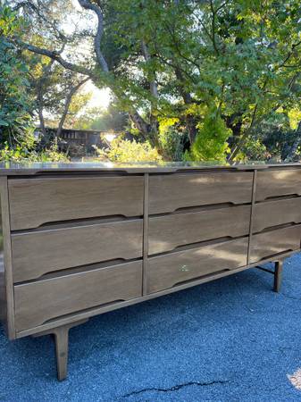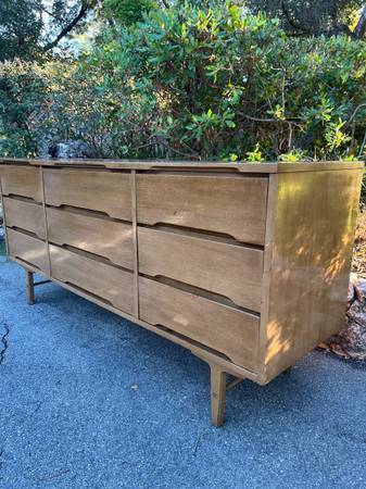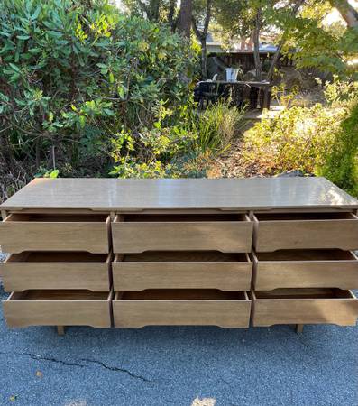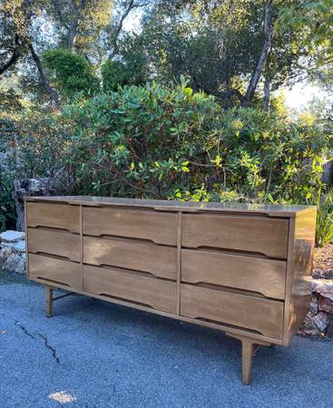 This vintage mid-century dresser features nine spacious drawers and a sleek walnut finish. Sculpted recessed pulls lend subtle texture to the flat-front design, while tapered legs give the piece a light, modern stance.