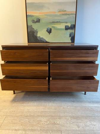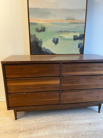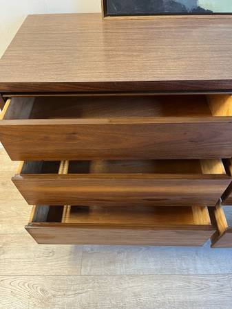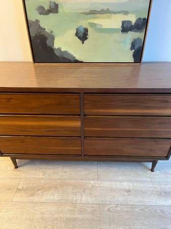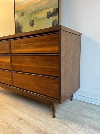 This mid century modern classic walnut low dresser likely by Broyhill is a stunning piece. With six drawers and long solid recessed walnut pulls, the lack of visible hardware lends an air of simplicity. This double lowboy has a reconditioned Formica laminate top and has been professionally refinished in our workshop. Resting on walnut tapered legs, this dresser is in excellent restored condition.