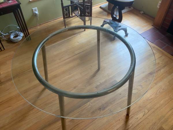 Round, glass top table with chrome stand. Dimensions: 41.5 inches in diameter, 29 inches high. Some minor scratches on glass, but generally very good condition. Glass sits on stand and can easily be removed for moving. We can provide local transportation, if necessary.