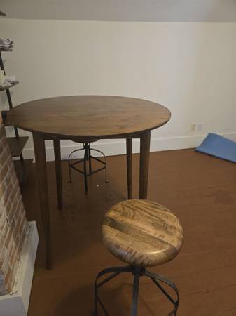 High quality bar stools. Table has solid wood legs and wooden veneer. The surface has some blemishes and the edge has a chip (see pics). $175 together. Otherwise, $75 / stool and $75 for the table