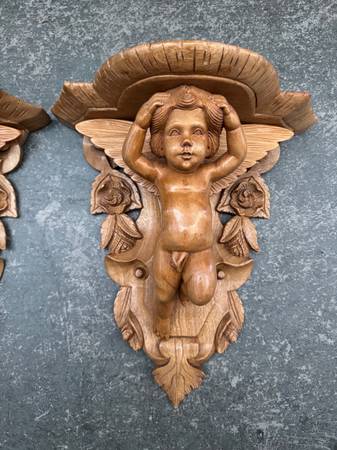 11” L x 7” D x 11” W Excellent condition Angel winged cherub folk art carving carved wood vintage antique traditional bohemian shelves decor