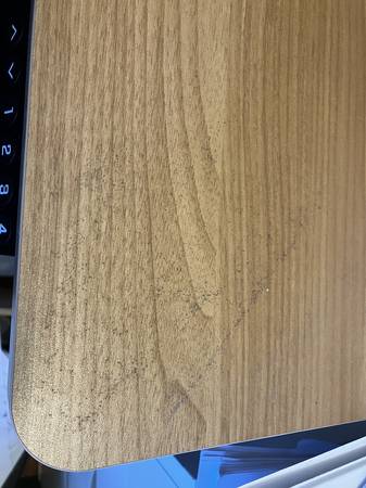 Two tier standing desk in great condition. No complaints, just moving and can't take it with me. Maple colored desktop 48" long by 24" wide. Height ranges from 28.7" to 48.4". Some residue on lower...