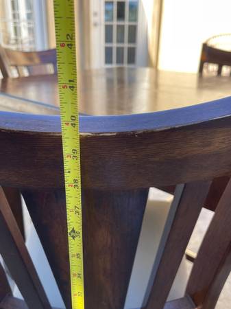 Extendable high dining table and four chairs. The set is pre-owned, shows minor signs of wear, hence the price and has lots of life left to it! There is a slight bubble on the table--see the last picture. The chairs have been reupholstered.