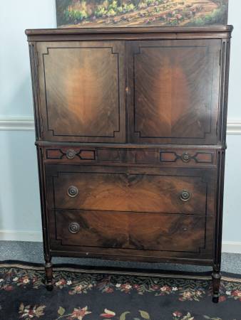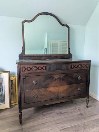 -Furniture: Herman Miller Aeron Ergonomic Desk Chair, Ornate Antique Vanity Style Dresser with Matching Wardrobe and Full Size Bedframe by John Widdicomb, Pair of Clean Microfiber Couches, Breakfast Nook w/ Bench, Tables & Chairs, Corner Cabinet/Hutch, Meyer & Danziger Secretary Desk, Entry Console Table, Nightstands and More!