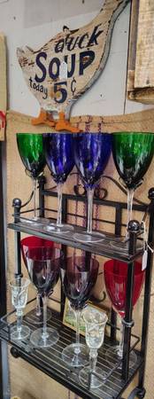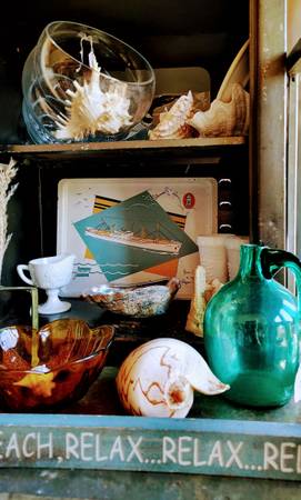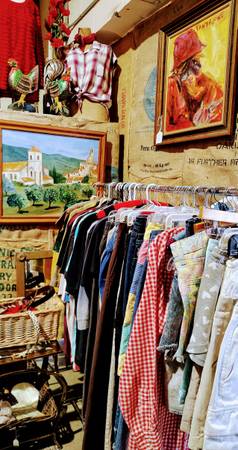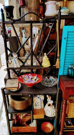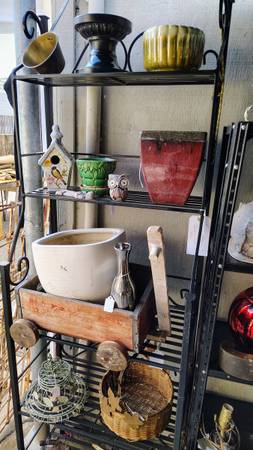 Vintage and antique clothing, garden including metal garden shelves, and other decor