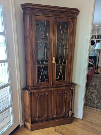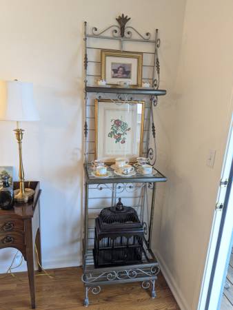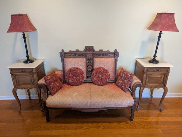 -Gorgeous vintage French, Eastlake and ornately carved furniture! Large mirrored oak armoire, Chippendale style dresser and entryway table, carved settee, marble-top Eastlake style nightstands and small tables, Georgian corner cabinet, clawfoot wrought iron bakers rack w/ glass shelves, scrolled steel dining room table, six chinoiserie cane chairs, French oval gold gilt wooden mirror, mahogany chiffonier buffet hutch, and more!