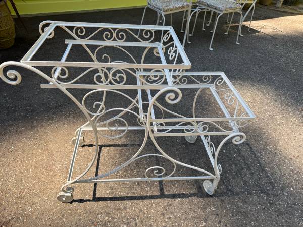 Vintage wrought iron tea cart- from the 1950’s. In great shape, sturdy and can be used for many things ; tea/coffee service, plants, books, etc. No glass on the shelves. Can be used with glass, wood...