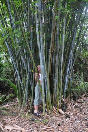 Bambusa chungii (a.k.a. Tropical Blue Bamboo, Emperor's Blue Bamboo) grows 25 to 30 feet tall in Northern California. It grows fast and makes big fat canes up to 2.5 inches in diameter. We recommend you give at least a 4' diameter circle of dirt for each plant. The available plants include 2 gallon pots for $85, 5 gallon pots for $150, and 15 gallon pots for $295. The plants are in stock now.