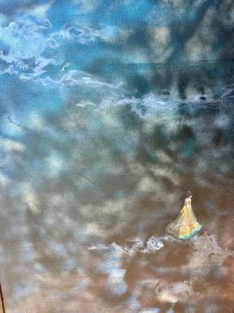 Beautiful Large format, approximately 35” wide by 50” tall mixed media painting, framed and wired for hanging. Details shown in photos- see the dolphins hiding in this beautiful painting?
