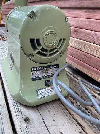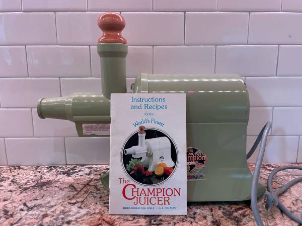 Vintage avocado green Champion juicer for sale! Works perfectly and looks cute. Includes all accessories and recipe booklet. The blade is a little worn and discolored but still works great- easily...