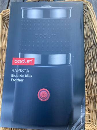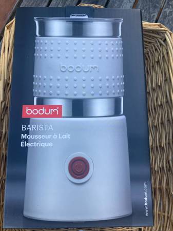 Brand New Item. The color is white Bistro 13.5oz Bistro Barista Electric Milk Frother, Automatic Temperature Control, Boil-Dry Protection, White Original price is $80