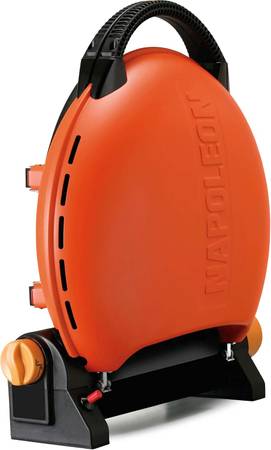 This is a new, never cooked with, portable gas grill – Napoleon TravelQ TQ2225PO Portable Gas Grill, 225 sq. in, orange with folding legs and a travel bag. I bought this in June 2020 from Amazon ($199) plus the travel bag ($39). It's a cool design but we have yet to use it – hence it's time to sell it off.