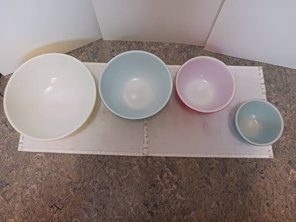 4 Vintage PYREX nesting bowls! Primary colors. All 4 are in great condition, no cracks, solid, strong colors. I had them on display for a few years and then put them in my cupboard for many years after. I bought them locally as used and I have not used them, only for display.