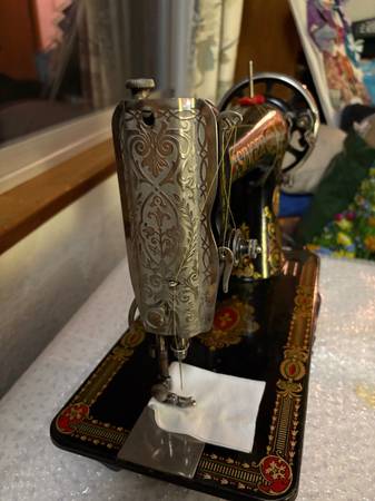 Beautiful Red Eye , new motor. Sews well. Includes cabinet. Collector’s item. Scratch on inside lift up leaf of cabinet. Local pick up. Cash.