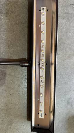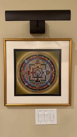 3 LED lamps for pictures paintings wall art. dark bronze color. light bar 16" wide, distance from wall 9". adjustable. wireless. uses 4 C-cell batteries. I'll include 8 rechargeable batteries if you have a charger. easy to mount and easy to remove for battery change. I think I paid $59 for each. a set of 3 for $39. example illumination in photo, first with room light only, second with art light added.