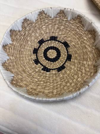 Three gorgeous baskets that can either be hung on the wall or used on a table, lots of decorative options, hooks on the back for hanging. Ranging from 14.5” across to 24” across.