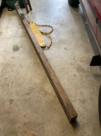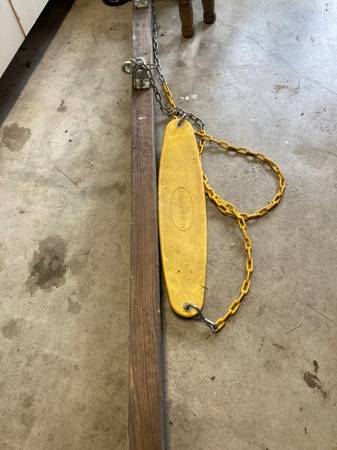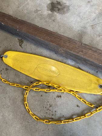 Heavy duty swing with chains and fasteners mounted to an 8' redwood 6 x 3. Swing and Slide brand, weatherproof and sturdy.