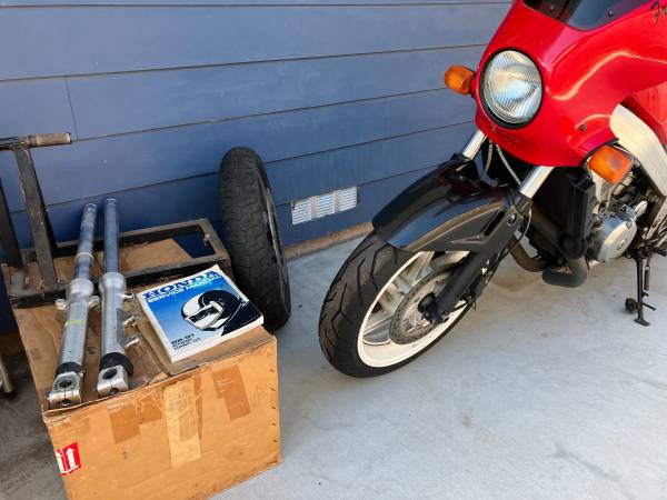 1989 Honda Hawk located in Santa Cruz. Bike was running when parked about 10 years ago. Will need fuel drained, carbs cleaned and new battery to get back on the road. Clean title, PNO status. Bike currently has a front end from a CBR F2. Original front end included. Fox Racing shock has been mounted. Removable front fairing.