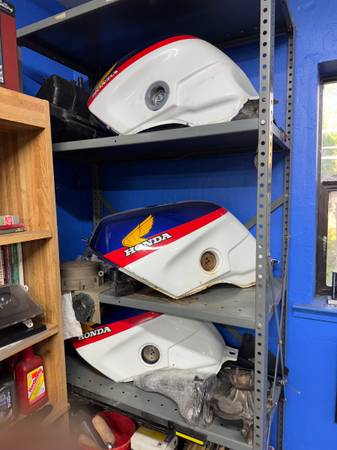 I have a huge volume of 1986 VFR 750 interceptor parts from forks to wheels to gas tanks to random parts even factory new clutch parts and exhaust system all sorts of stuff I just don’t have the time to eBay it all so I’m here just giving you a number and trying to get it out of here… there are many other parts not specifically VFR 750 interceptor parts that are also available but we can talk about them when you’re here… just finally cleaning my garage out…