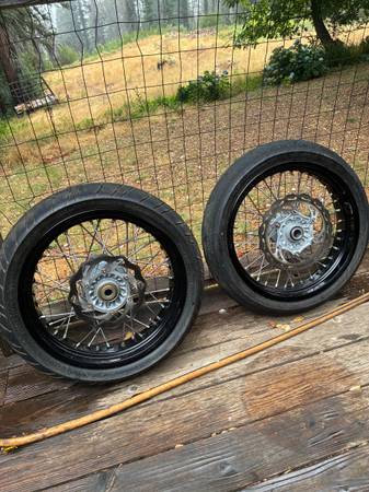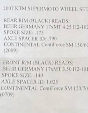 2007 KTM super Moto set rear rim, black reads beer Germany 17 XNT4.25 H2 – 102 spoke size .175 axle spacer ID .790 continental contiforce SM l50/60 2009 Front rim black reads behr Germany 17 x MT...