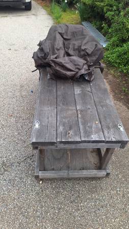 Solid wood work table on Caster wheels with lower shelf storage, anchor tie points and a wheel chock.