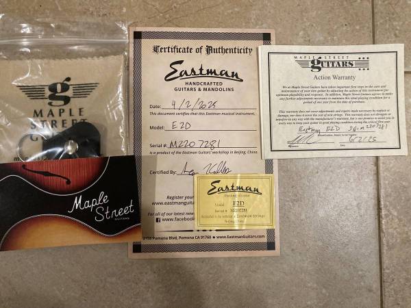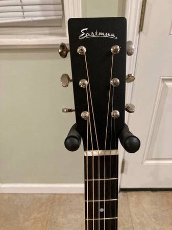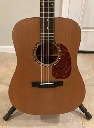 This guitar is a solid cedar top, solid sapele back and sides, with a thin satin finish. Standard 25.4" scale with a nice round C neck. Bone nut and saddle. Ebony fretboard and bridge. 1 3/4" nut. The cedar top on a dread creates this interesting warm vibe that works for both fingerpicking and strumming. The guitar is in like new condition. No scratches, dings, dents at all. I've stored it properly humidified in a smoke free home. Comes with an Eastman gig bag.