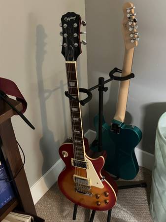 Not so gently used Epiphone and like new Squire for sale plus Mustang amp. Comes with headphones.