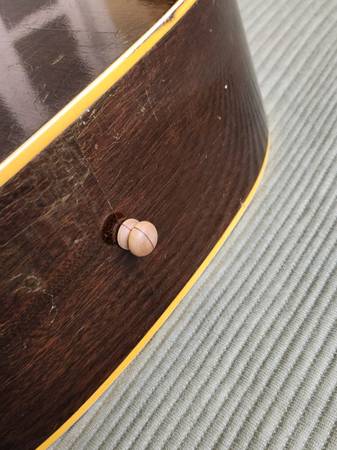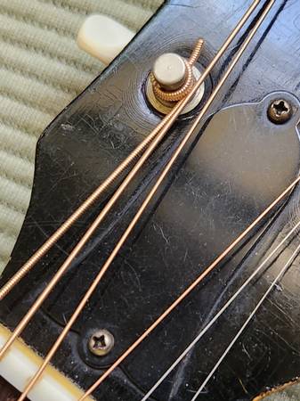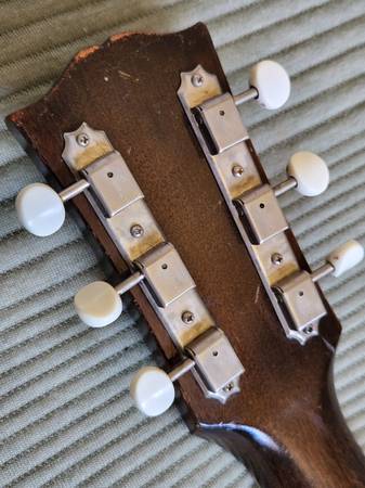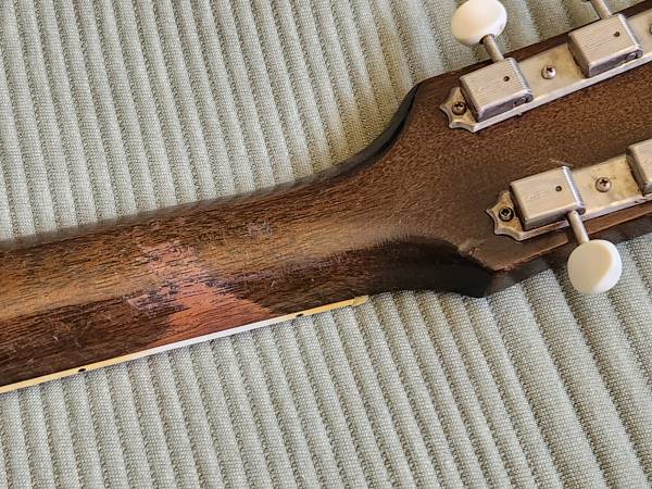 This 1953 example is a player and has playwear and use typical of an instrument of its age. All original with the exception of the tuner buttons and the bottom strap button. The neck was reset by a luthier in Oregon who wedged the upper frets on the body up to bring them in line with the rest of the fret board improving the playability. The original case is long gone.