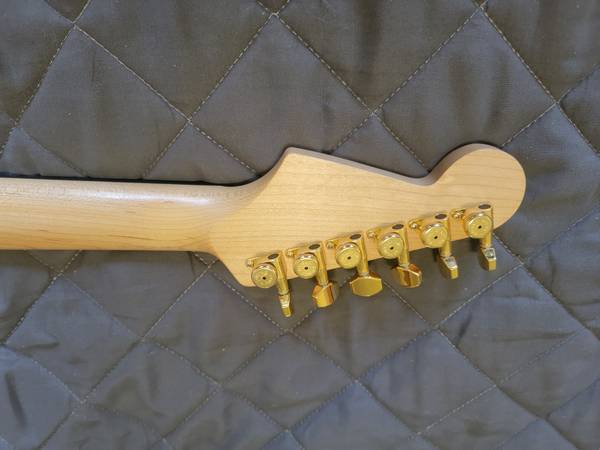 Custom warmoth strat, mahogany body, quilted top with 24 fret ebony fingerboard. Dimarzio pickups with Fender american tremolo ( tremelno) installed to lock trem) locking tuners with 5 way Super switch to get inner/outer coils in positions 2 and 4. Really nice guitar for great price!