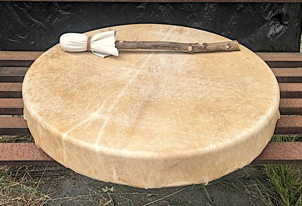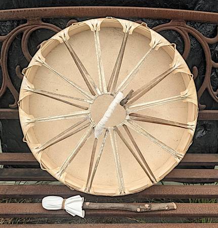 We offer medicine drums made with a variety of skins and of various sizes for sale. This includes 13" goat skin drums, as well as 14", 18", 20 " and 22" elk skin drums. Prices range from $140 to $340, depending on size and type of skin.
