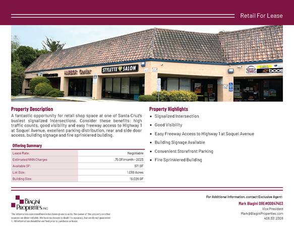 * Good Visibility and Easy Freeway Access to Highway 1 at Soquel Avenue