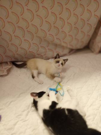 I am looking for homes for these 3 adorable kittens a feral mother brought to my driveway three weeks ago. The 2 Tuxedos are boys, Tyler and Wesley. the Siamese mix is a girl, Claire. They are 3 months old. I had mom spayed and took in the kittens to socialize and get off the street and into good homes. I already have 8 rescue cats myself and currently unemployed and struggling to feed and manage 3 extra mouths! They have tamed up pretty well but need a little more time and work to be fully unafraid of people (they are about 80 percent there)! They are litter box trained, and very playful. They love other cats but have not been around a dog yet. I think they would adjust to a friendly, calm dog and children. They need a home with another friendly cat or with one of their siblings. Adoption fee is negotiable. I prefer a homeowner and previous or current cat owner who believes that their pets are family FURREVER! I will consider a renter if all checks out in screening process. I want to make sure they go to good, loving homes. If you would like a meet and greet, I am in San Jose and you can see them in their environment as they would be nervous and different going to someones house. They are really sweet and healthy. I can also send you videos of them.