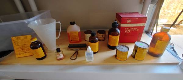 Vintage "wet" darkroom equipment for sale, from the Silver Halide photography days - - Kodak original "D-76" developer, and "Microfine" developer, unopened - Kodak original Fixer, Stop Bath, etc -...