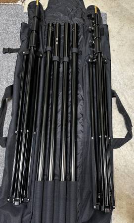Calumet Back-drop set in a case/bag. Stands will go to 12 ft. tall by 9 ft wide if I remember right. Excellent condition. 140.00