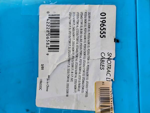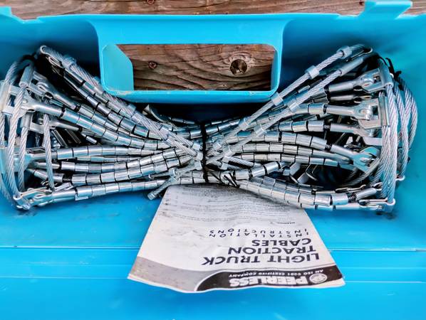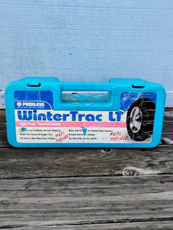 Peerless Winter Trac LT model 019655 tire chains, like new, never used. This is NOT universal fit; these fit only the specific sizes listed in the picture. Check your tire size against the sizes listed in the picture before purchasing. $40 For pick up only.