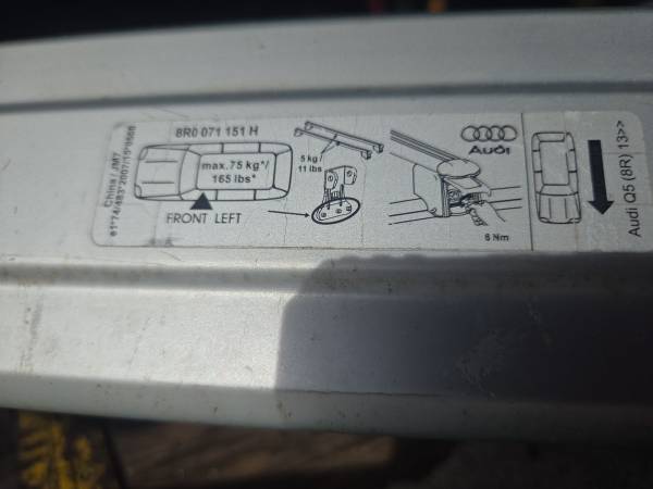 Audi Q5 roof rack crossbars in excellent condition and includes torque wrench to mount. Fits years 2013 through 2017. They measure 48 -1/2" & 49-1/2". Please leave phone number with reply and I...