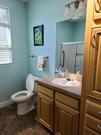Bathroom is shared with one person. This is a 3 bedroom, 2 bath manufactured home in an all age mobile home park, in a very safe quiet neighborhood with nice neighbors. Park has pool, hot tub, clubhouse, pool table.