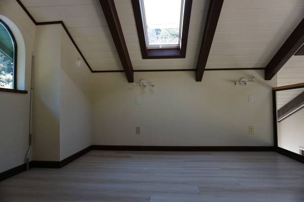 This airy studio has plenty of natural light from the many windows, skylights, and high ceilings. The layout has a lots of open floor space that takes advantage of the natural light creating an uncluttered creative environment.