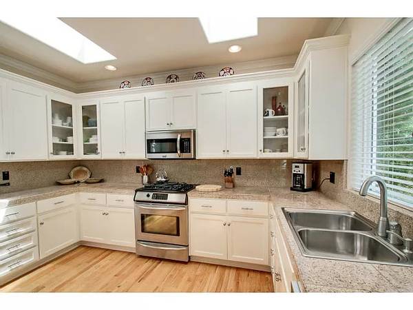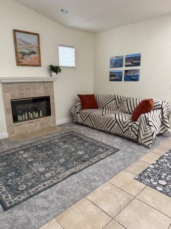 The house is open plan and very spacious. Multiple skylights let in natural light throughout the house. Downstairs has an eat-in kitchen, half bathroom, 3 large common areas, and laundry room with washer/dryer. The house is fully furnished (except for the bedroom listed here). The kitchen features stainless steel appliances, gas range, granite countertops, and a large overhead skylight. Private back yard with space for outdoor furniture. The yard backs up to the neighborhood park, during the day you will hear kids playing but inside with windows closed it's pretty quiet.
