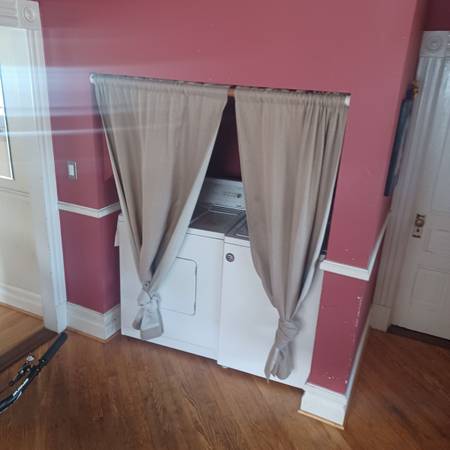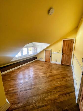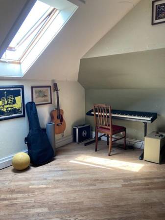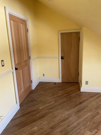 The upstairs bedroom for rent has a dormer full of glass windows. Just restored in plaster has two closets rough but cute one has a stained-glass window in it with cedar floor. Natural 3/4 oak floors. Solid core six panel Doug fur main and bathroom doors, vaulted ceilings, woodwork in oil paint. Very quiet with no common walls to share. The upstairs has a living room with stained glass and a operable deluxe skylight that acts as a window.