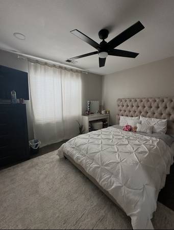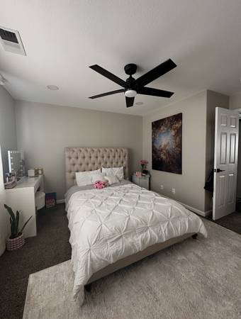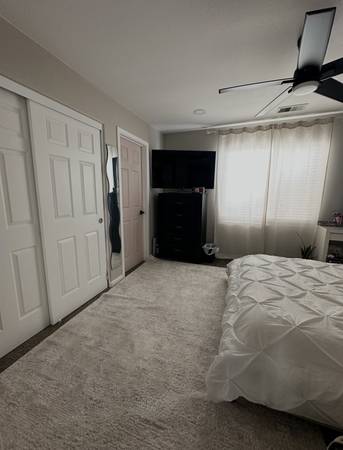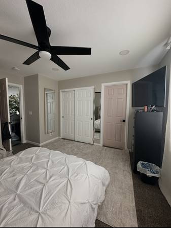 The room that is available is located upstairs. It is 13 X 13 with a large window. There is a large closet, a ceiling fan, and recessed lighting. There is a private entrance to a full bathroom with a double sink, and a separate toilet and shower. The bathroom is shared with the other room that is occupied by one female.