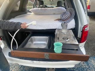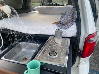 PULL-OUT KITCHEN W/SINK AND RUNNING WATER, 2 BURNER STOVE AND A SHOWER SYSTEM.