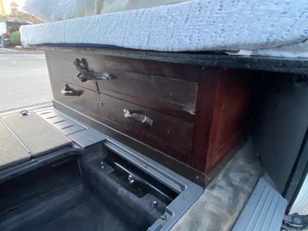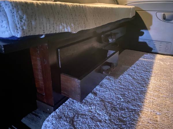 LOTS AND LOTS OF STORAGE , CUSTOM FUTON WITH BEDDING.