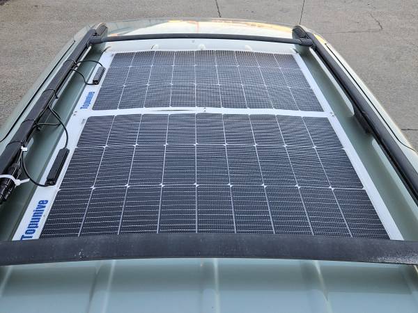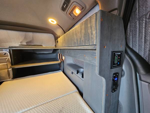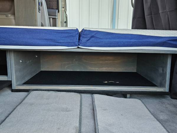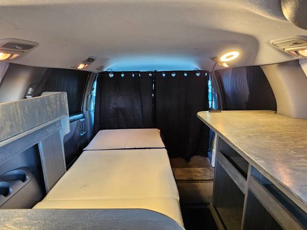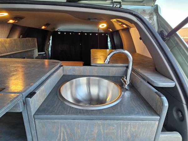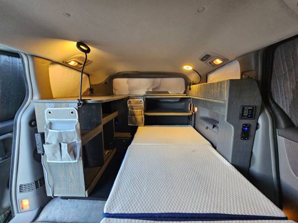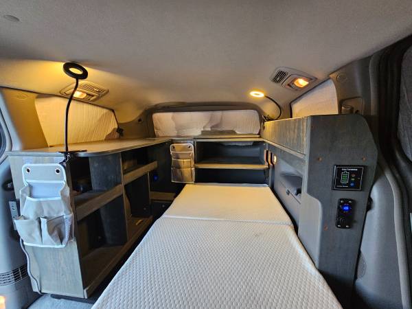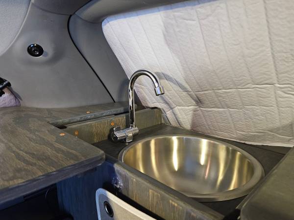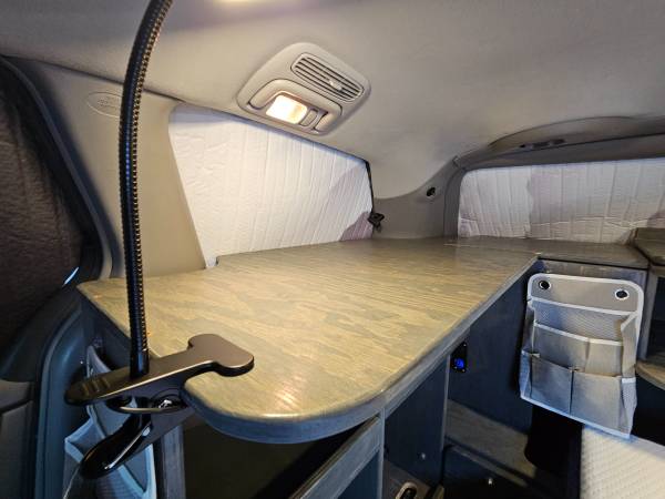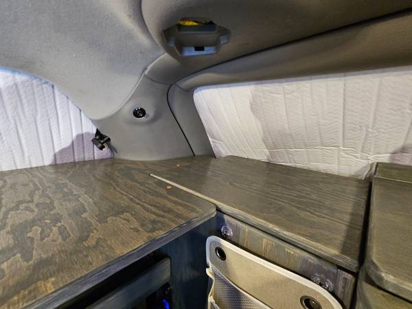 The camper build can also be used as a mobile office by utilizing a spacious counter with plenty of outlets to charge your laptop, USB devices, and more. All your electrical charging and powering of devices is handled by a combination of 200 Watt fixed solar panels, a 10 Amp solar controller along with a 100 AH Lithium Ion Battery. There is also an 1500 Watt Inverter to allow you to plug in your some of your home devices. A smart isolator has been installed to allow the Lithium Ion battery to be charged by the engine's alternator when the vehicle is running or by the solar panels when the vehicle is parked.