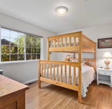The downstairs bedroom features a bunk bed with a twin on top over a double bed on the bottom. Near a full bathroom with a large closet and bureau, this room is wonderful for kids and/or a small family.