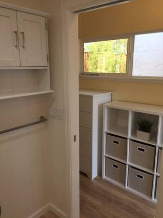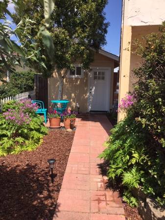 This cute, 220 sq ft, completely separate from the main house, legal studio is four-year old construction and it’s available for one person. If you think tiny house living, you’ll be stoked. This studio is definitely small, but is ideal for someone who doesn’t have a lot of stuff with them. The ideal tenant is someone who is in the Santa Cruz area for a short time for work or school, who is a traveling healthcare worker or similar, whose house is under construction and they just need a place for a short time, or someone who is moving to Santa Cruz and needs a temporary place until permanent housing is found. Leases are for three to six months only.
