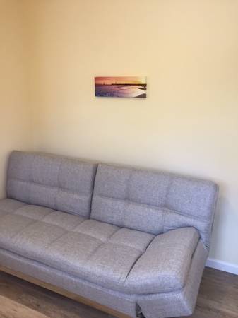 The studio has a Coddle sofa (like a futon) that easily converts into a bed. It also includes a 32” TV with Xfinity cable and WiFi. The high ceiling makes the studio look and feel larger and it has a ceiling fan and light.