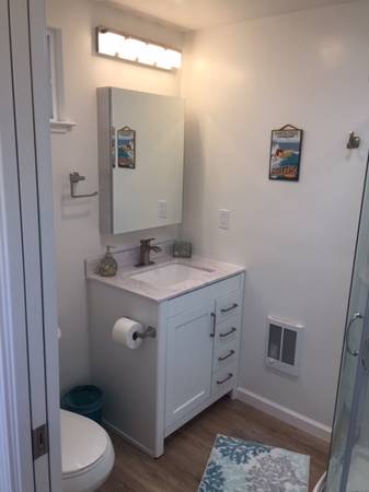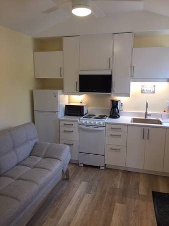 The kitchenette has a four-burner electric stove and oven, sink with garbage disposal, and apartment-size refrigerator. It also includes essentials for basic cooking (pots, pans, plates, utensils, etc), as well as a toaster oven and coffee maker. The bathroom has a stand-up shower stall, sink, toilet, and a sun tunnel for excellent day-time lighting.