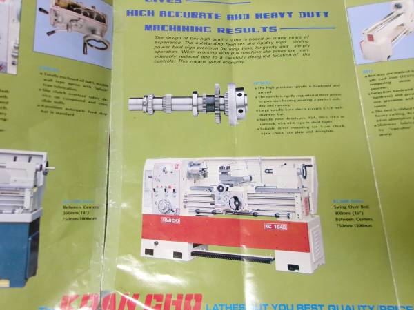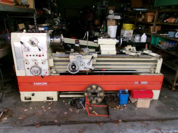 very nice Koan Cho Taiwan made gear head engine lathe 18x60. Comes with steady rest , follower rest , KDK tool post and holders, 3 jaw, 4 jaw , face plate, albrecht chuck. It has a removeable chip pan and a back splash. D1-6 camlock spindle 2 1/8" spindle hole, #4 mt tailstock, English and metric threading & more, gear head. 3 phase 220 v We have manuals and brochures. bought new in 1984 very little used. These are still made and sold by importers like ATrump we can load with a fork lift. M-F 10-5