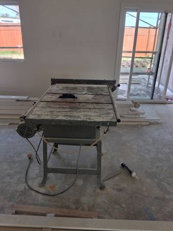 delta tablesaw. 10" marples combination blade. fence works great stays square and and micro adjustments are easy. positive fence lock. runs on 240vac or 120vac. it has been a great saw for many years. tilts right. arbor bearings are smooth as butter.